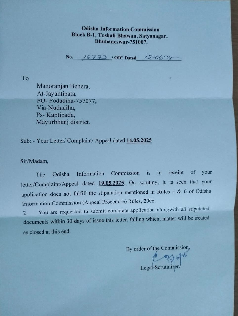 BHUBANESWAR: ଏହି ଚିଠିଟି ସୂଚନା କମିଶନ ଙ୍କ ଦପ୍ତର ରୁ ମୟୁରଭଞ୍ଜ ଜିଲ୍ଲାର ଜଣେ ସାଧାରଣ ଲୋକଙ୍କ ନିକଟକୁ ପଠାଯାଇଛି l ଏହି ଚିଠିରେ ଲେଖାଯାଇଛି ଯେ, “ଆପଣ ଙ୍କ ଅପିଲ ଓଡିଶା ସୂଚନା କମିଶନ ଅପିଲ ପ୍ରକ୍ରିୟା ରୁଲ ର ରୁଲ 5 ଏବଂ 6 ଅନୁଯାୟୀ ହୋଇନଥିବାରୁ ଆପଣ ଙ୍କ ଅପିଲ ଫେରସ୍ତ କରାଗଲା l 30 ଦିନ ମଧ୍ୟରେ ପୂଣି ଥରେ ଅପିଲ କରିବାକୁ ଜଣାଇଦିଆଗଲା l