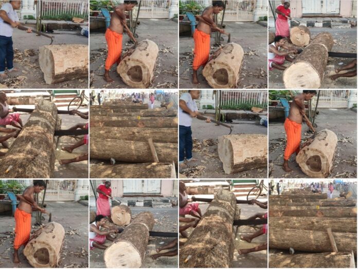 ରଥ ନିର୍ମାଣର ଶୁଭାନୁକୂଳ ପରେ, ରଥ ନିର୍ମାଣକାରୀ ସେବକ ମାନେ ଆଜି ସକାଳ ଘ.୮.୦୦ ଟିକା ସମୟରେ ରଥ ଖଳା ଠାରେ ଉପସ୍ଥିତ ହୋଇ ଉପସ୍ଥାନ ଦେଇଥିଲେ, ତିନି ରଥର କରତୀ ସେବକ ମାନେ ମୁଖ୍ୟ ମହାରଣା ମାନଙ୍କ ପରାମର୍ଶ କ୍ରମେ ତିନିରଥ ପାଇଁ ଉଦ୍ଦିଷ୍ଟ ଫାଶୀ କାଠକୁ ମାପ ପ୍ରକାରେ ଗଡ କରି ତାଳଧ୍ଵଜ ଚାଳି, ଦର୍ପଦଳନ ଚାଳି, ଏବଂ ନନ୍ଦିଘୋଷ ଚାଳି କୁ ଦୁଇଟି ଲେଖାଏଁ ତୁମ୍ୱ ଗଡକରି ଯୋଗାଇଥିଲେ, ତିନି ରଥର ସୁତାର ମହାରଣା ଗଡ ତୁମ୍ବ କାଠରେ ଘେର ମାପ ଚିହ୍ନ ଦେବାପରେ ତିନି ରଥର ମହାରଣା ସେବକ ମାନେ ବାରିସି ରେ ମର୍ଦ୍ଦଳ।କାର ଭାବେ ହାଣି ଗୋଟିଏ ଗୋଟିଏ ତୁମ ନିର୍ମାଣ ଜାରୀ ରଖିଛନ୍ତି।