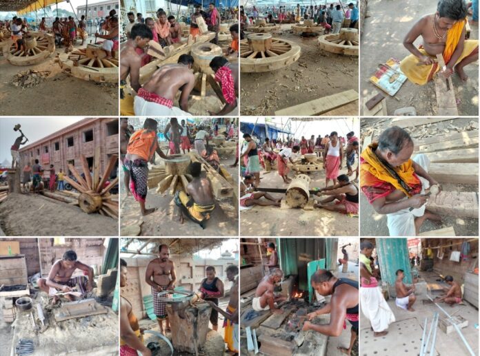 କମାର ଶାଳ- ଦୋଳ ବେଦୀ ଅସ୍ଥାୟୀ କମାର ଶାଳ ରେ ଓଝା କମାର ସେବକ ମାନେ ତିନି ରଥର ନାହାକା ଚକ ର ଆବଶ୍ୟକ ଅର କଣ୍ଟା ସହ ପନ୍ଦାରି ଏବଂ ତୁମ୍ବ ବାହ୍ୟ ବଳା ରଥ ଖଳାକୁ ଯୋଗାଇ ବାକି ଚକ ଗୁଡ଼ିକ ପାଇଁ ପନ୍ଦାରି ଏବଂ ତୁମ୍ବ ବଳା , ଆର କଣ୍ଟା ନିର୍ମାଣ ଜାରୀ ରଖିଛନ୍ତି।
