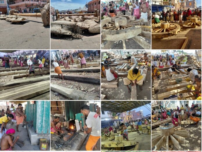 PURI/BHUBANESWAR: ଆଜି ବିଂଶ ତମ ଦିବସରେ ତିନି ରଥର ନିର୍ମାଣକାରୀ ସେବକ ମାନେ ସକାଳ ଘ.୮.୦୦ ଟିକା ପୂର୍ବରୁ ରଥଖଳା ଠାରେ ଉପସ୍ଥିତ ପୂର୍ବକ ଉପସ୍ଥାନ ଦେଇ ମୁଖ୍ୟ ମହାରଣାଙ୍କ ମାର୍ଗ ଦର୍ଶନରେ ନିର୍ମାଣ କାର୍ଯ୍ୟ ଆରମ୍ଭ କରିଥିଲେ।ଗତକାଲି ପବିତ୍ର ଭଉଁରୀ ତିଥିରେ ତିନି ରଥର ଚକ – ଅଖ ସଂଯୋଗ ପୂର୍ବକ ଚକ ଡେରା ଅନୁକୂଳ ନୀତି ସମ୍ପନ୍ନ ହୋଇଥିଲା. ତିନିରଥ ର ଚକ ନିର୍ମାଣ ସହ ଭୂଇଁ ଚଉତା, ଖମ୍ୱୀ ଏବଂ ନିରାଡ଼ି କାଠର ଚଉପଟ କାର୍ଯ୍ୟ ଜାରୀ.