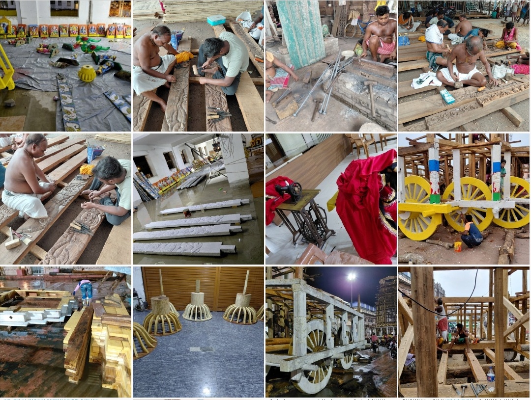 ଦୋଳବେଦୀ ଅସ୍ଥାୟୀ କମାର ଶାଳରେ ଓଝା ସେବକ ମାନେ ତିନିରଥ ଶୁଆ ଫିଟିଙ୍ଗ ପାଇଁ ନାରାଜ କଣ୍ଟା ଏବଂ ପୋଟଳ ପାଇଁ ଜଙ୍ଘା କଣ୍ଟା ନିର୍ମାଣ ଜାରୀ ରଖିଛନ୍ତି।