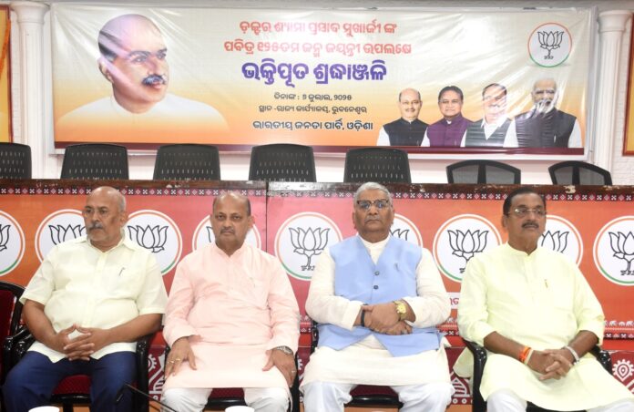 ରାଜ୍ୟ କାର୍ଯ୍ୟାଳୟରେ ସ୍ୱର୍ଗତଃ ଡ.ଶ୍ୟାମା ପ୍ରସାଦ ମୁଖାର୍ଜୀଙ୍କ ୧୨୫ ତମ ଜନ୍ମଜୟନ୍ତୀ ପାଳନ-ଡ.ଶ୍ୟାମାପ୍ରସାଦ ମୁଖାର୍ଜୀ ପାର୍କରେ ଥିବା ପ୍ରତିମୂର୍ତିରେ ମାଲ୍ୟାର୍ପଣ କରି ଶ୍ରଦ୍ଧାଞ୍ଜଳି ଜଣାଇଲେ ବିଜେପି ନେତୃବୃନ୍ଦ
