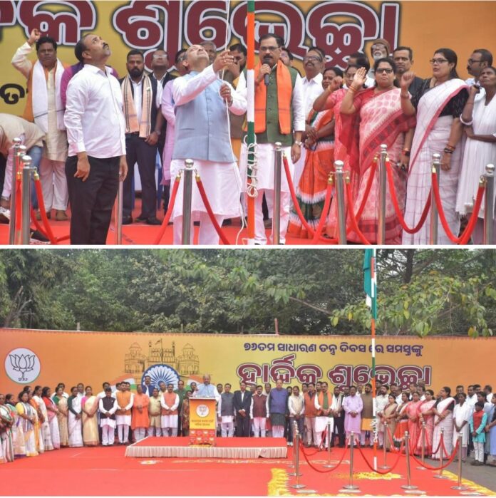 BHUBANESWAR: ଆଜି ରାଜ୍ୟ କାର୍ଯ୍ୟାଳୟରେ ବହୁ ଆଡମ୍ବର ଭାବେ ଦେଶର ୭୬ତମ ସାଧାରଣତନ୍ତ୍ର ଦିବସ ପାଳିତ ହୋଇଯାଇଛି । ଏହି ଅବସରରେ ରାଜ୍ୟ ସଭାପତି ଶ୍ରୀ ମନମୋହନ ସାମଲ ଜାତୀୟ ପତାକା ଉତୋଳନ କରିବା ସହ ଓଡ଼ିଶାର ସାଢ଼େ ୪କୋଟି ଜନତାଙ୍କୁ ସାଧାରଣତନ୍ତ୍ର ଦିବସର ଅଭିନନ୍ଦନ ଓ ଶୁଭେଚ୍ଛା ଏବଂ କୃତଜ୍ଞତା ଜଣାଇଥିଲେ । ଏହାପରେ ସାମୂହିକ ଭାବେ ଜାତୀୟ ସଂଗୀତ ଗାନ କରାଯାଇଥିଲା ।