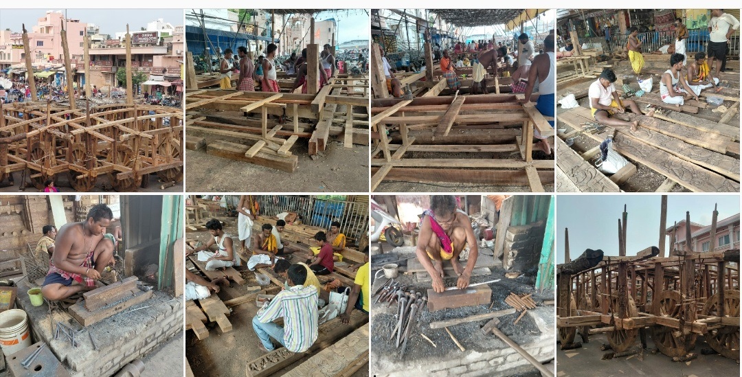 ଦୋଳବେଦୀ ଅସ୍ଥାୟୀ କମାର ଶାଳ ରେ ଓଝା ସେବକ ମାନେ ତିନି ରଥର ଭୂଇଁ କଣ୍ଟା ଏବଂ ପୋଟଳ କଣ୍ଟା ନିର୍ମାଣ ଜାରୀ ରଖିଛନ୍ତି।