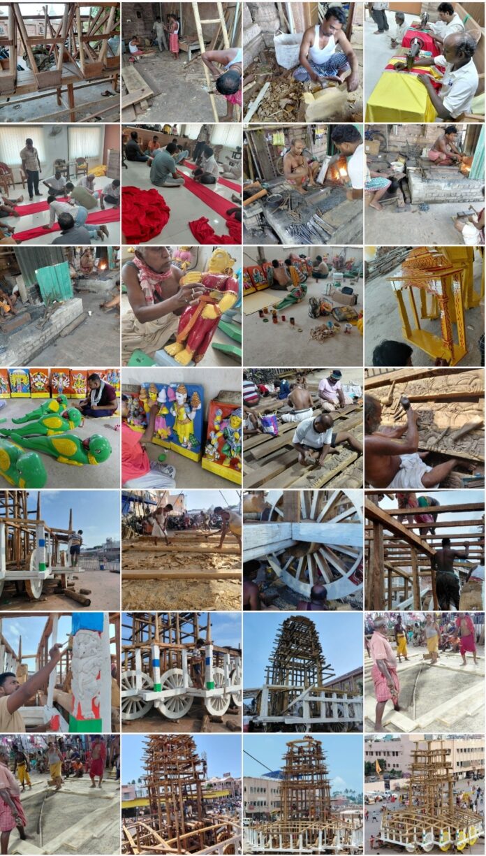 PURI: ଆଜି ରଥ ନିର୍ମାଣର ୪୫ ତମ ଦିବସରେ ରଥ ନିର୍ମାଣକାରୀ ସେବକ ମାନେ ରଥ ଖଳା ଠାରେ ସକାଳ ଘ.୮.୦୦ ଟିକା ପୂର୍ବରୁ ଉପସ୍ଥିତ ହୋଇ ଉପସ୍ଥାନ ଦେଇ ମୁଖ୍ୟ ମହାରଣାଙ୍କ ମାର୍ଗ ଦର୍ଶନରେ ରଥ ନିର୍ମାଣ କାର୍ଯ୍ୟ ଆରମ୍ଭ କରିଥିଲେ।)