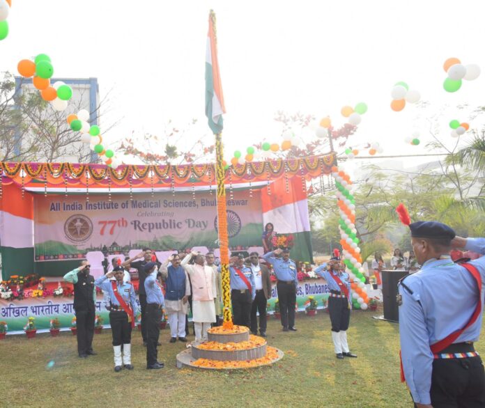 BHUBANESWAR:AIIMS Bhubaneswar commemorated the 77th Republic Day with great patriotic enthusiasm and solemn pride. The celebration began with the unfurling of the National Tricolour by the Executive Director, Dr. Ashutosh Biswas, in the presence of faculty members, students, and staff of the institute.