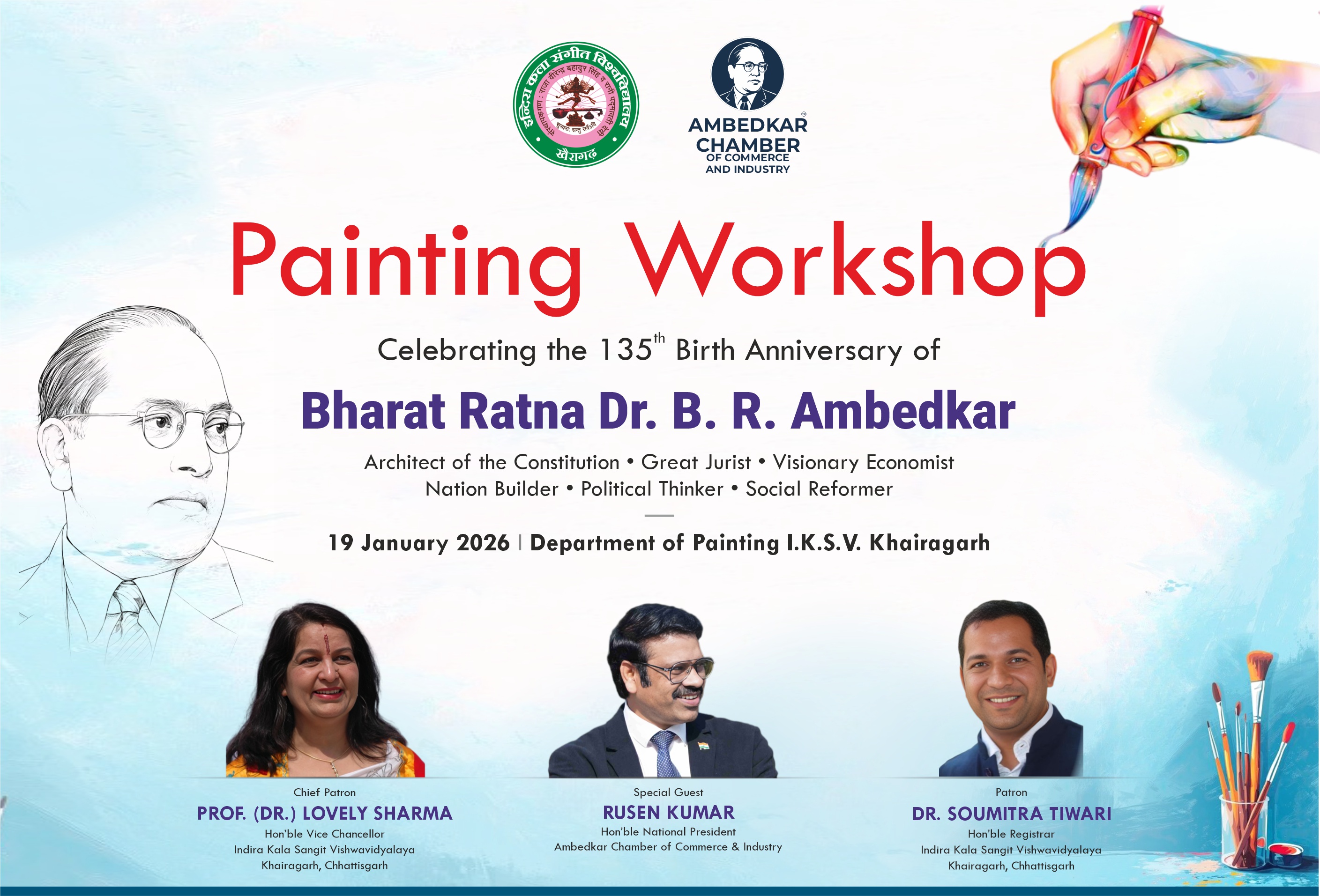 RAIPUR:The Ambedkar Chamber of Commerce and Industry, in collaboration with the Painting Department of Indira Kala Sangeet Vishwavidyalaya (I.K.S.V.), Khairagarh, Chhattisgarh, is organising a One-Day Art (Painting) Workshop on Dr. B.R. Ambedkar on January 19, 2026.