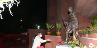 Dharmendra Pradhan offered Floral Tribute at the statute of Gandhiji in...