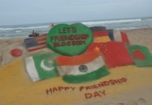 PURI:On the eve of International Friendship Day, International sand artist Manas Kumar Sahoo creates a sand sculpture on the golden sea beach...