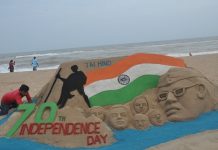 PURI:On the eve of 70th Independence Day, International sand artist Manas Kumar Sahoo created a sand sculpture on the golden sea beach...