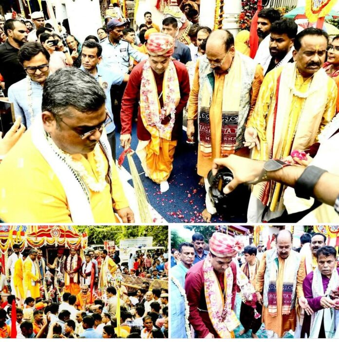 NEW DELHI:47th Bahuda Yatra Festival celebrated at the main Jagannath Temple of the National Capital Region at Hauz Khas village in New Delhi amidst spectacular fanfare and spiritual fervour. Commencing from the wee hours in the morning all the religious rituals were performed before the Trinity at Adap Mandap inside Aunt’s House at the Basement of the Temple with utmost solemnity by the priests of the temple. At about 4.00 p.m. the Four Deities were taken in Dhadi Pahandi procession from the Gundicha Temple to the aesthetically and elegantly decorated chariot stationed at the Grand Road in front of the temple.The whole ambience got reverberated with the recitals of hymns, shouting of slogans like Hari Bol, Jai Jagannath and playing of musical instruments like Ghanta, Mardala, Jhanja and Mrudanga by the devotees and servitors.The incessant rain in the afternoon here was seeming like showering of Lord of the Universe’s blessings from sky.