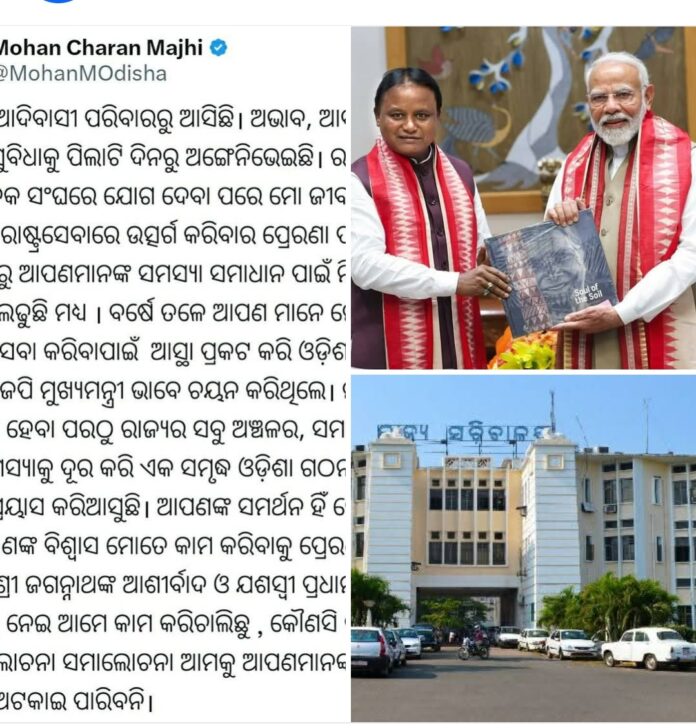 Here is the Odia social media post of CM Majhi : ମୁଁ ଗରିବ ଆଦିବାସୀ ପରିବାରରୁ ଆସିଛି। ଅଭାବ, ଆବଶ୍ୟକତା, ଦୁଃଖ, ଅସୁବିଧାକୁ ପିଲାଟି ଦିନରୁ ଅଙ୍ଗେନିଭେଇଛି। ରାଷ୍ଟ୍ରୀୟ ସ୍ୱୟଂସେବକ ସଂଘରେ ଯୋଗ ଦେବା ପରେ ମୋ ଜୀବନକୁ ସମାଜ ଓ ରାଷ୍ଟ୍ରସେବାରେ ଉତ୍ସର୍ଗ କରିବାର ପ୍ରେରଣା ପାଇଥିଲି। ସେବେଠାରୁ ଆପଣମାନଙ୍କ ସମସ୍ୟା ସମାଧାନ ପାଇଁ ନିରନ୍ତର ଲଢ଼ିଛି ଓ ଲଢୁଛି ମଧ୍ୟ । ବର୍ଷେ ତଳେ ଆପଣ ମାନେ ମୋତେ ରାଜ୍ୟର ସେବା କରିବାପାଇଁ ଆସ୍ଥା ପ୍ରକଟ କରି ଓଡ଼ିଶାର ପ୍ରଥମ ବିଜେପି ମୁଖ୍ୟମନ୍ତ୍ରୀ ଭାବେ ଚୟନ କରିଥିଲେ। ମୁଁ ମୁଖ୍ୟମନ୍ତ୍ରୀ ହେବା ପରଠୁ ରାଜ୍ୟର ସବୁ ଅଞ୍ଚଳର, ସମାଜର ସବୁ ବର୍ଗର ସମସ୍ୟାକୁ ଦୂର କରି ଏକ ସମୃଦ୍ଧ ଓଡ଼ିଶା ଗଠନ ପାଇଁ ନିରନ୍ତର ପ୍ରୟାସ କରିଆସୁଛି। ଆପଣଙ୍କ ସମର୍ଥନ ହିଁ ମୋର ଶକ୍ତି, ଆପଣଙ୍କ ବିଶ୍ୱାସ ମୋତେ କାମ କରିବାକୁ ପ୍ରେରଣା ଦିଏ। ମହାପ୍ରଭୁ ଶ୍ରୀ ଜଗନ୍ନାଥଙ୍କ ଆଶୀର୍ବାଦ ଓ ଯଶସ୍ୱୀ ପ୍ରଧାନମନ୍ତ୍ରୀଙ୍କ ପ୍ରେରଣାକୁ ନେଇ ଆମେ କାମ କରିଚାଲିଛୁ , କୌଣସି ବାଧା ବିଘ୍ନ, ଆଲୋଚନା ସମାଲୋଚନା ଆମକୁ ଆପଣମାନଙ୍କ ସେବା କରିବାରୁ ଅଟକାଇ ପାରିବନି।.