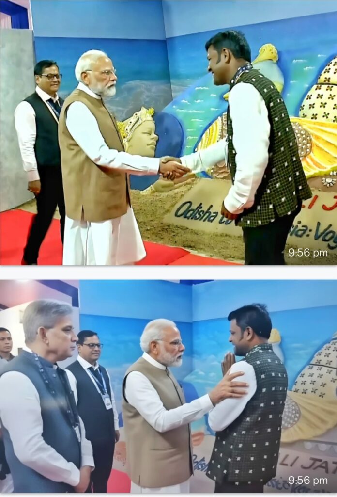 The artist presented to the Hon’ble Prime Minister his sand art inspired by Bali Jatra — a tribute to Odisha’s ancient maritime legacy and historic trade links with Indonesia. He also shared the significance of Kartik Purnima, the sacred day when seafarers from ancient Odisha set sail on overseas voyages symbolising courage, devotion, and exploration.