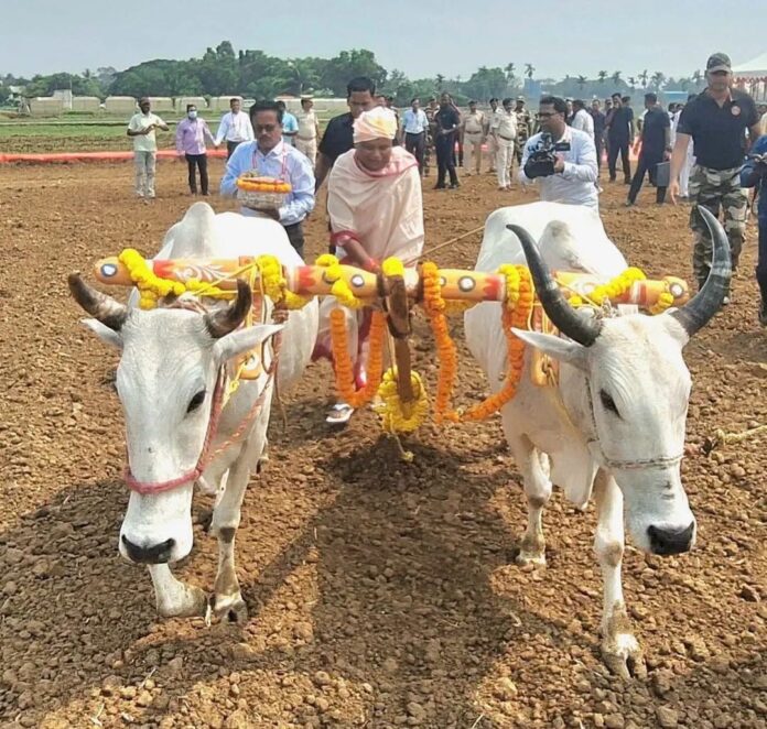 Akhi Muthi closely involved in the state-level Farmers’ Day celebrations. The Chief Minister arrived in the morning and participated in the puja-yagna, ploughed the fields and sowed seeds. He did this work in the traditional manner by tying a turban on his head.