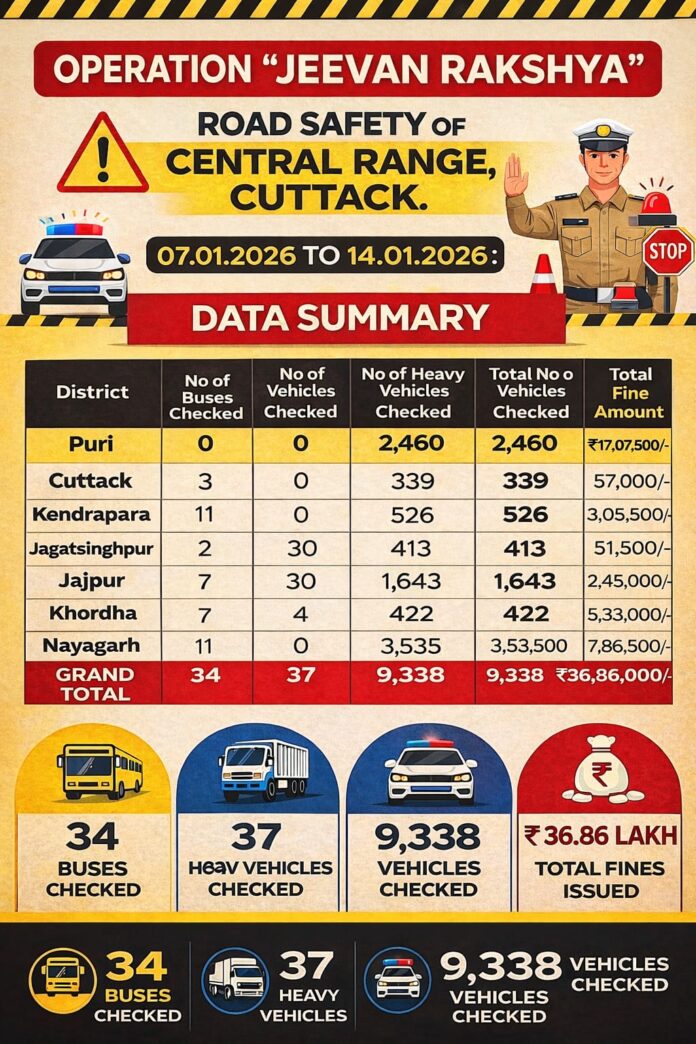 CUTTACK:Under Operation “Jeevan Rakshya”, the Central Range Police, Cuttack undertook an intensive road safety enforcement drive from 07.01.2026 to 14.01.2026 across all districts of the range with the objective of ensuring safer roads and promoting responsible driving behavior.