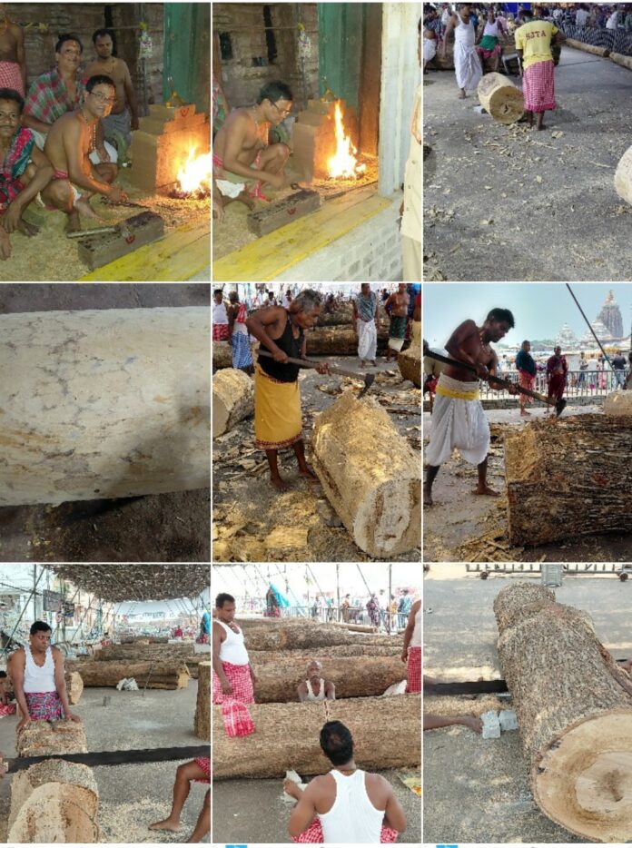 PURI/BHUBANESWAR:On the second day of chariot construction, the three chariot construction on Wednesday workers arrived at the chariot workshop before 8:00 AM and joined the construction work.)