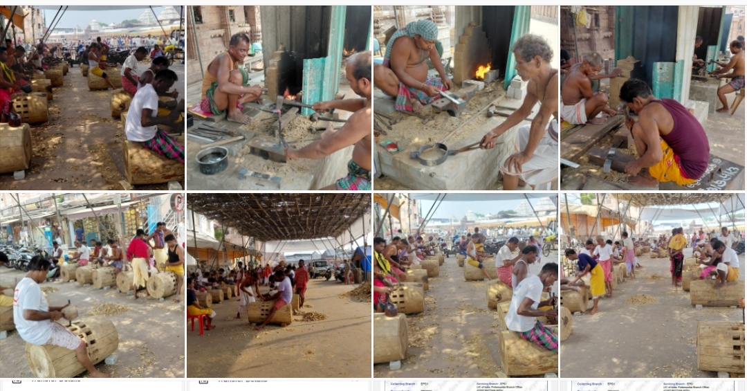 Today, at the temporary blacksmith shop of Dolavedi, the three chariot blacksmiths have continued to prepare the axles of the three chariots and make ‘Pandari Bupta’ to sit on the axles of the Tumba. By the end of today’s work, the three chariot blacksmiths have made the required pandari bupta for three or three wheels, prepared the axles of two or three wheels, and have cut and stored the GI iron rods required for making the axles of the remaining wheels.