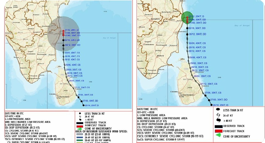 It is very likely to move slowly northwards parallel to North Tamil Nadu-Puducherry and south Andhra Pradesh coasts and weaken into a depression during next 12 hours. The system will be centered over southwest & adjoining west central Bay of Bengal within a minimum distance of 30 km from the Chennai coast by noon of today, the 01st December.