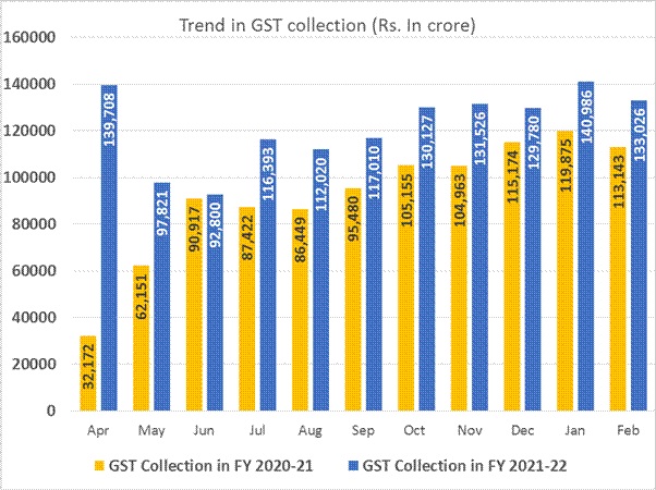 This is for the fifth time GST collection has crossed Rs 1.30 lakh crore mark. Since implementation of GST, for the first time, GST cess collection crossed Rs 10,000 crore mark, which signifies recovery of certain key sectors, especially, automobile sales.