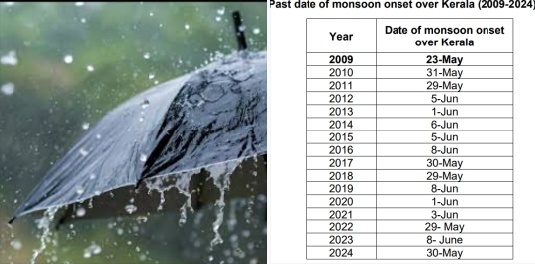 BHUBANESWAR: Southwest Monsoon has set in over Kerala today, the 24th May, 2025, against the normal date of 1st June. Thus, southwest monsoon has set in over Kerala 8 days before the normal date. This is the earliest date of monsoon onset over Kerala after the year 2009 when it was set in over Kerala on 23rd May 2009.