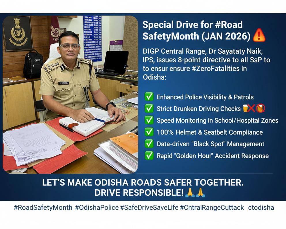 CUTTACK/BHUBANESWAR:In a proactive move to strengthen traffic safety across the region, Dr. Satyajit Naik, IPS, DIG of Police (Central Range), has issued a set of specialized directions to the Superintendents of Police (SsP) under his jurisdiction. These measures coincide with the Government of Odisha’s observance of National Road Safety Month beginning January 1, 2026.