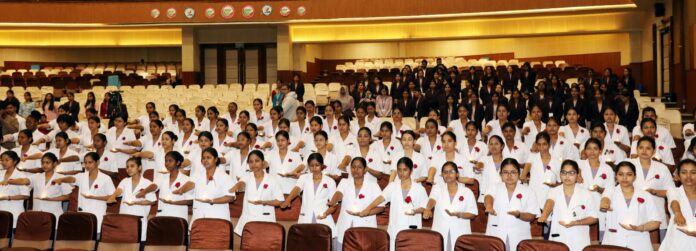 The event saw the swearing-in ceremony of 200 first-year B.Sc. Nursing and GNM students of the 2025-26 batch and the release of a booklet.