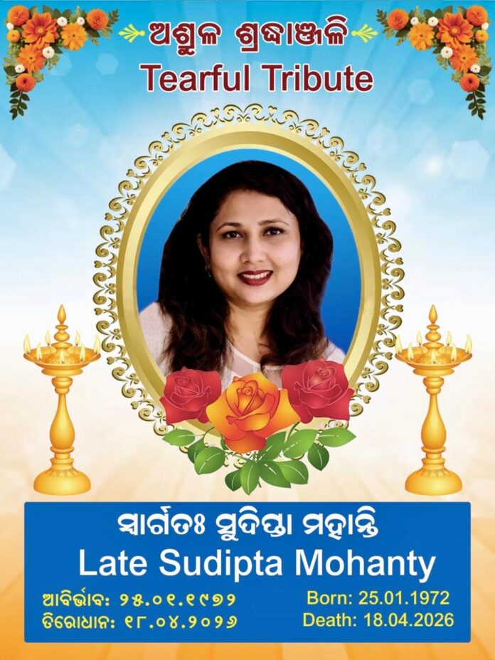 NEW DELHI/BHUBANESWAR:The untimely demise of Sudipta Mohanty evoked unprecedented shock and widespread sorrow among the members of Odia community in Delhi and National Capital region. 54 years old Smt Mohanty died on Saturday 18th April 2026 at 8.15 a.m. in morning in a private hospital at Noida after Pneumonia illness. Her last rites were performed on the same day at Noida. She was the wife of Noida based noted Chartered accountant, Founder Chairman of ATD Group, President of Samudayik Vikas Samiti, Chief Patron of World Odisha Society’s UP Branch , Founder and former Secretary of Noida Jagannath Temple’s Management Committee, Dr Manoranjan Mohanty. Smt Mohanty has left her lone daughter Arni Mohanty.